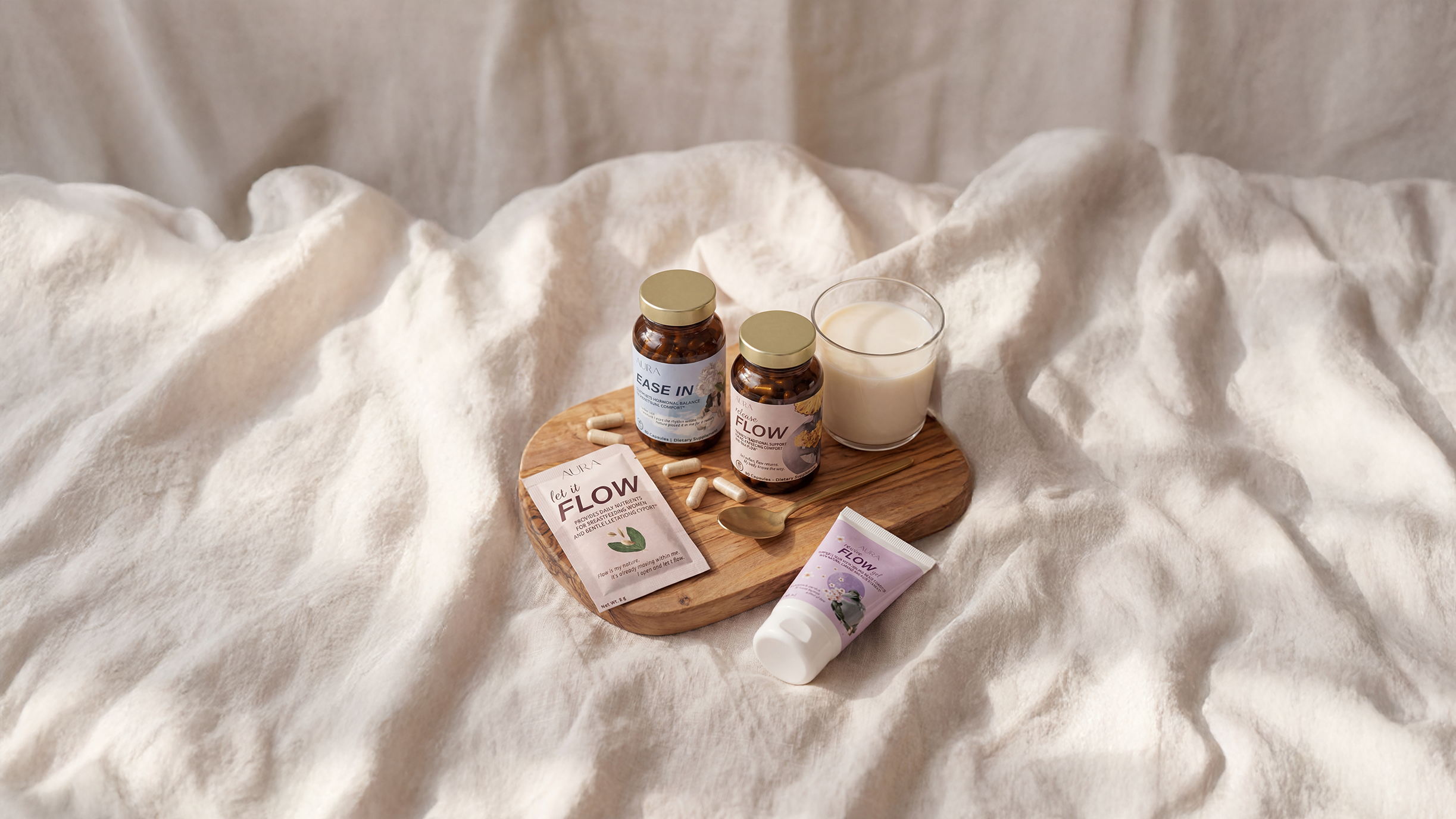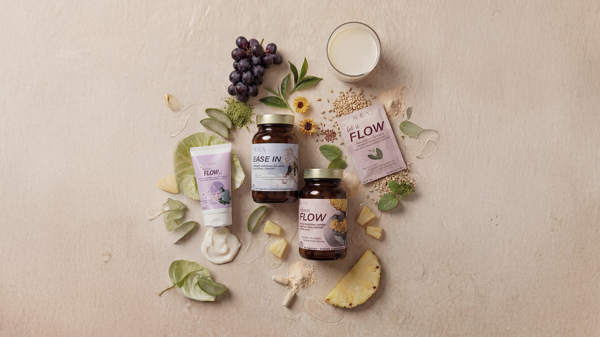 AURA blends mindfully crafted nutrients with intention, restoring balance to your hormones, calm to your mind, and helping a woman’s body reconnect with its own rhythm.